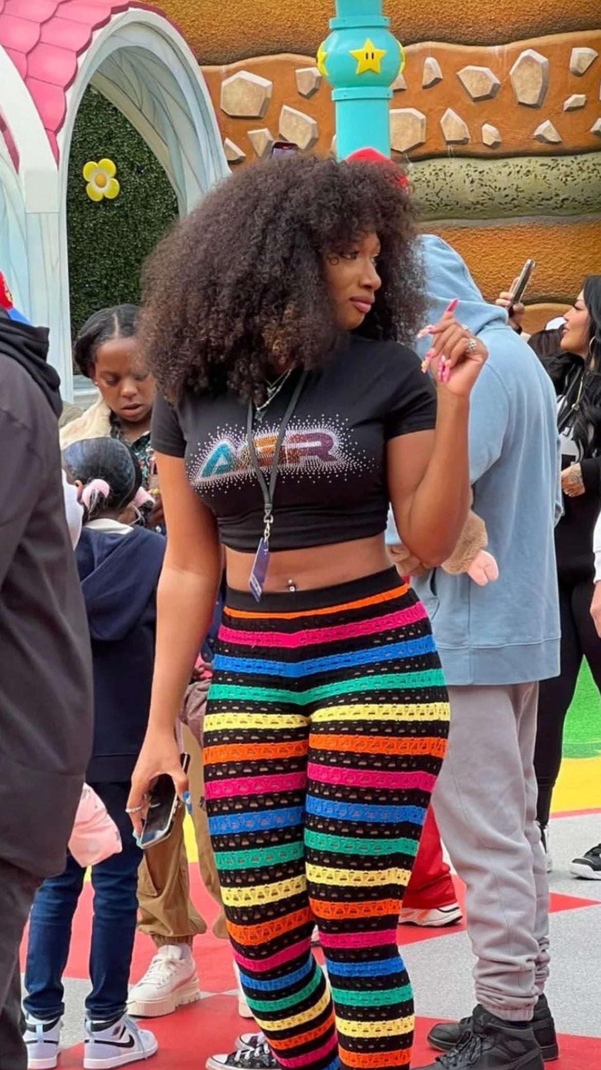 Meg Thee Stallion looking amazing at Universal Studios in full AGR. Wearing the SS23 AGR Burst Tee available to buy now on our webstore and SS23 Intimo Striped Trousers.