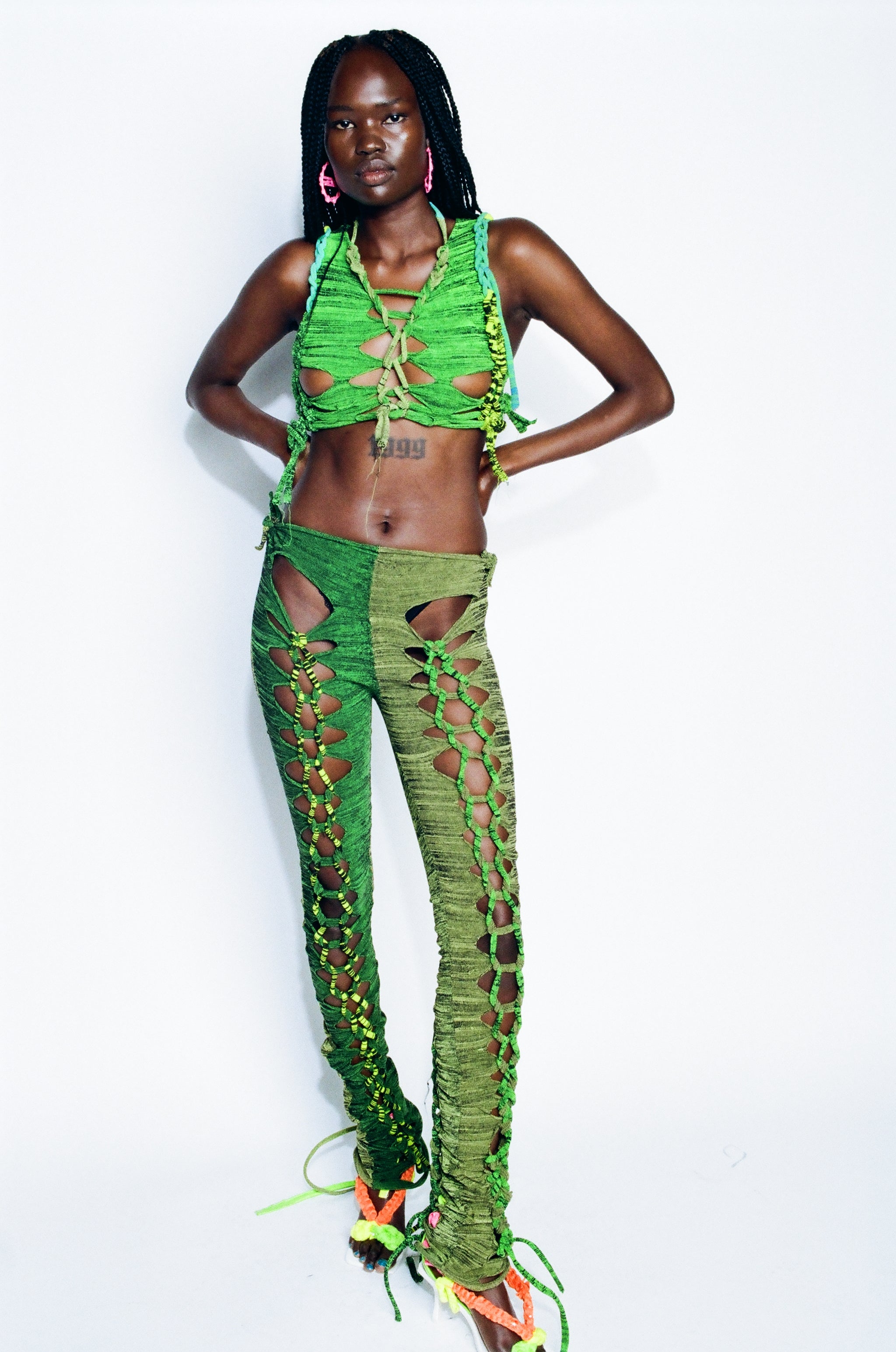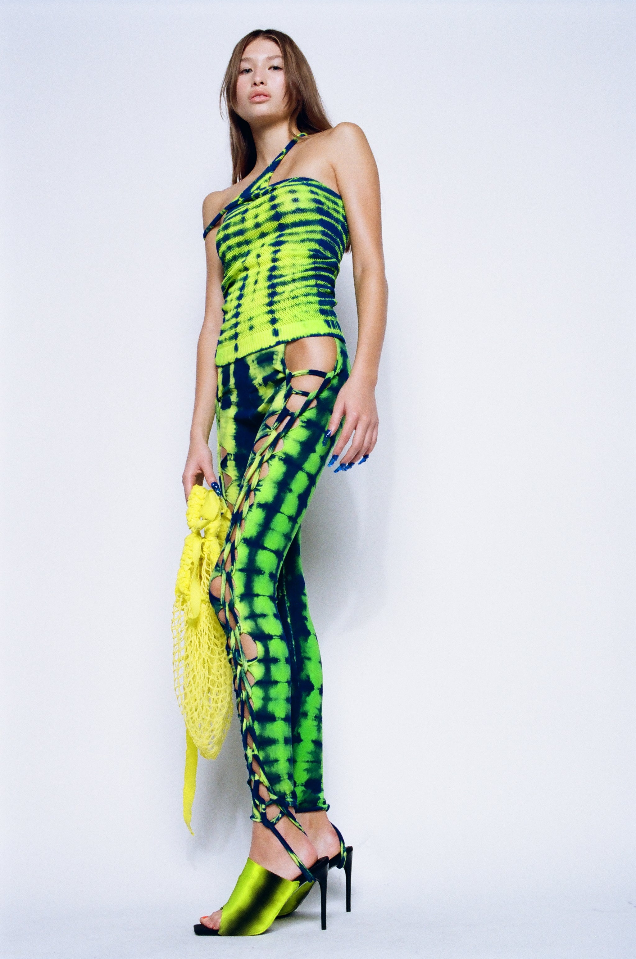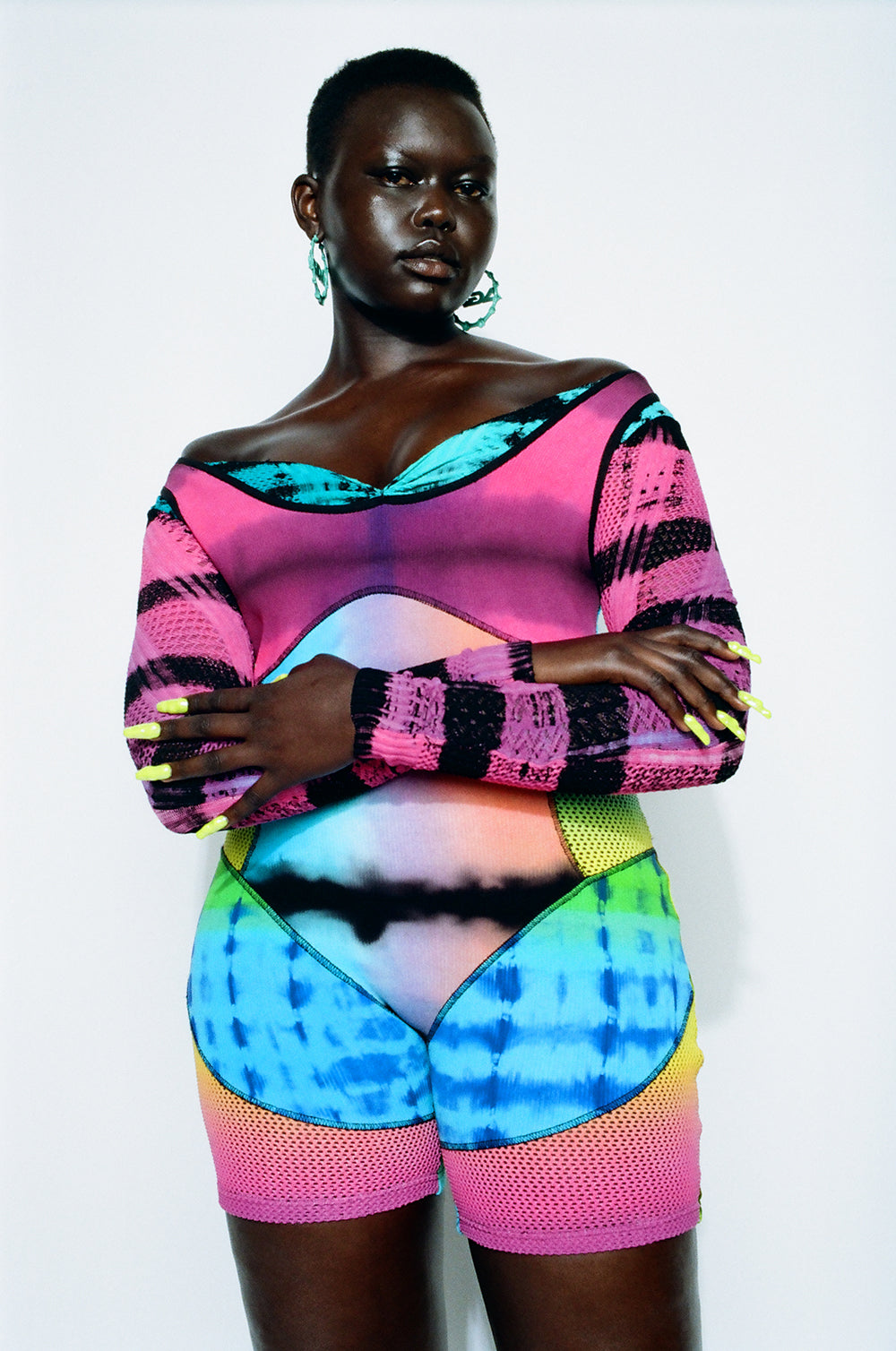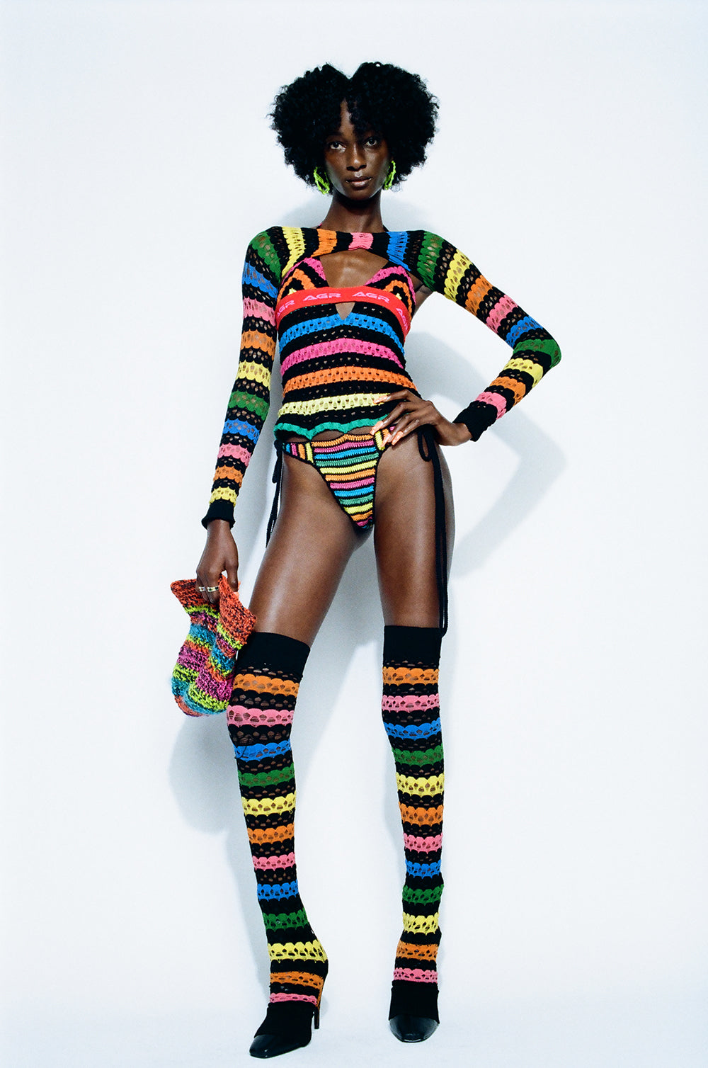 AGR’s Spring/Summer 2023 collection, aptly titled ‘Dripping in Colour’, is a true celebration of the brand’s journey: from handmade knits for Notting Hill Carnival, to creating an exclusive capsule for Nike Town, to now debuting at London Fashion Week. For this collection, creative director and founder, Alicia Robinson, seamlessly blends her signature designs, with new daring techniques and playful accessories. AGR continues to find the balance between fine-tuning their existing techniques and trialling out new processes. This season includes more recycled denim and explores metallic foiling on crochet, with Robinson elevating her tye-dying and knitted pointelle lycra techniques. The collection’s staple pieces transition seamlessly from daytime beachwear to all night dancing. Prints are inspired by Katharina Grosse’s fabric installations, with additional references to 90s sandblasted jeans, glistening swimwear and Sonia Rykiel’s iconic stripes. The collection’s colour theory was chosen with a clear intent to stimulate positive emotions and encourage mental wellbeing. ‘Dripping in Colour’ is brought to life with new accessories. AGR partnered with London based jewellers, Hatton Labs, to create a line of statement fluorescent pieces including resin-dipped earrings, a nod to Alicia’s signature hoops, and blinged out, gemstone rings. Other accessories include multi-coloured visors, flashy leather belts and handmade, Italian handbags. Showcasing the collection at London’s most iconic nightclub, Fabric, is a full circle moment for designer Alicia Robinson, who spent her formative years working late nights, as the door girl at Visions Nightclub. To continue paying homage to London’s nightlife scene, AGR called on DJ and friend, Jyoty Singh, for the shows’ music curation. Jyoty’s mix represents the collection’s tropical feel, with sounds from around the world, including ballet funk, dembow and UK funky. As AGR hits this new milestone, the core values of the brand, to invoke joy through colour, promote body positivity and create sustainably, ring as true as ever.