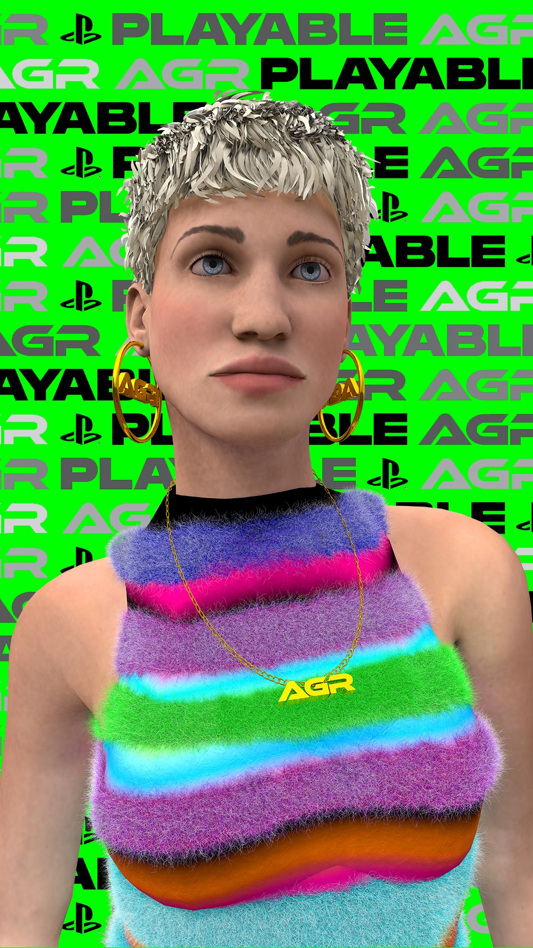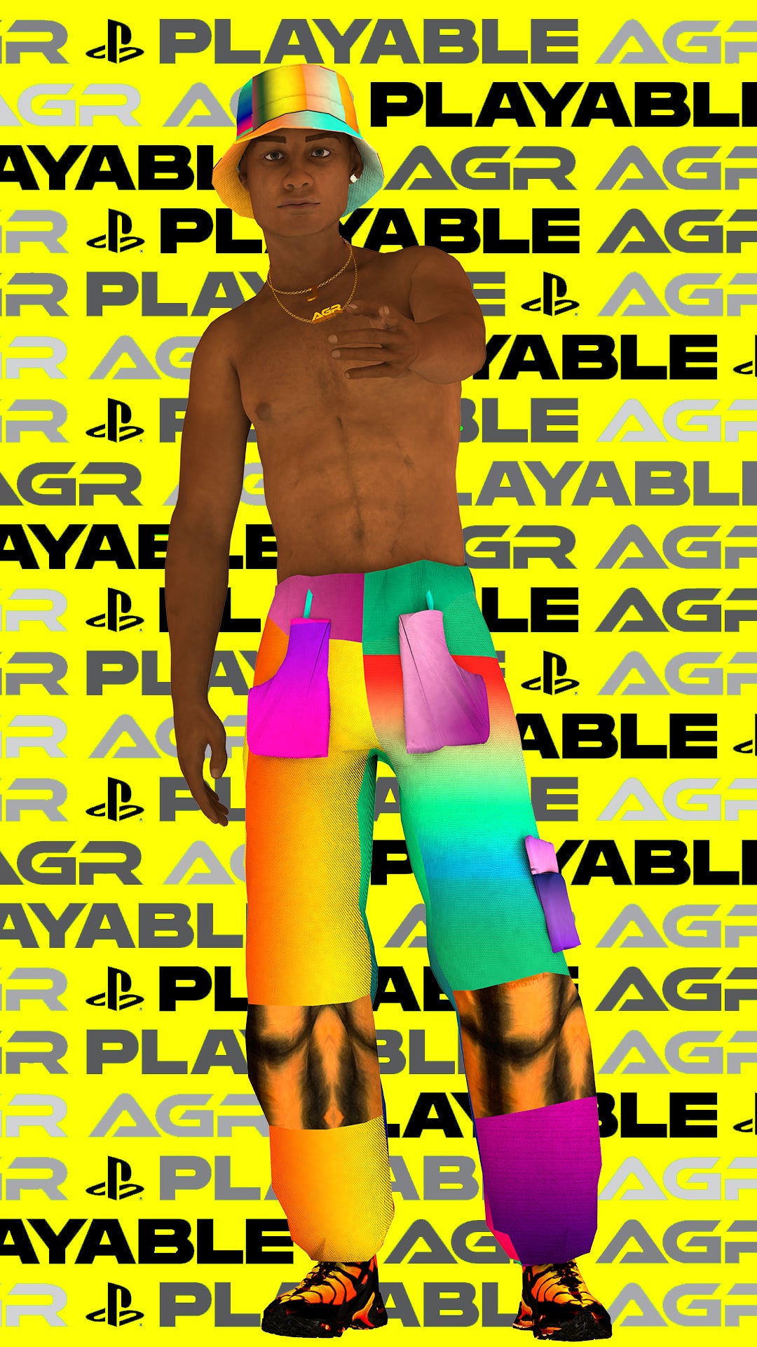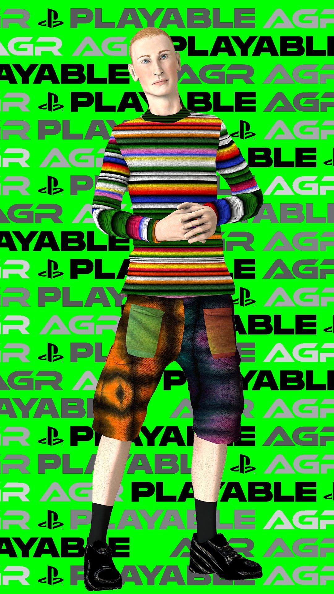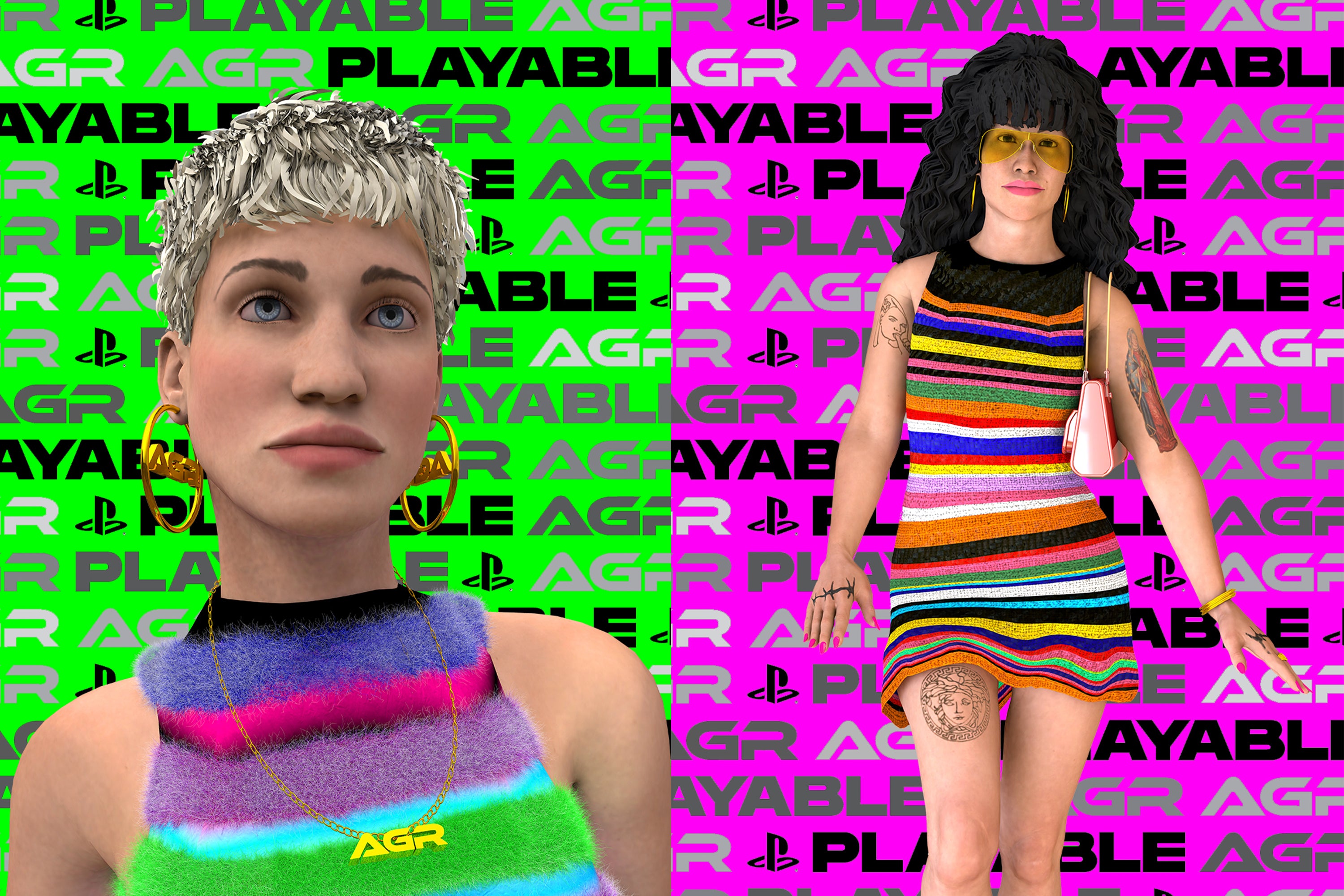 In 2019 AGR launched a new project with digital creative studio Sensergy for PlayStation’s first season of Playable with the help of Livity UK. Creating 3D avatars based on those closest to her, Alicia approached Sensergy to give a helping hand. “The designer wanted her friends to be the avatars – with very fun and light hearted animations in an online and offline form”. The result is a collection of character-based animations and artworks filled with colour, humour and an entirely unique way of presenting a new fashion collection. These avatars were also printed and postered around East London. Those featured in the short videos include Harry Fisher owner of 360 agency Htown, Troy Adams owner of Troy Casting, Rhiannon Barry owner of Ninety Fly and fashion stylist Jake Hunte. All the above are close friends and muses of the brand.