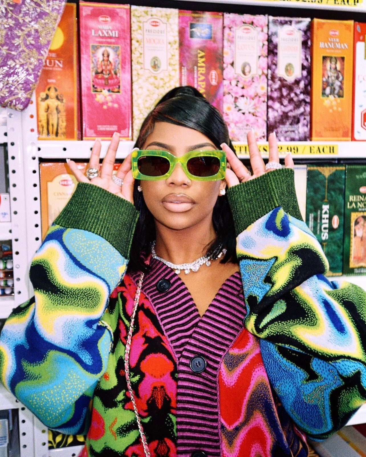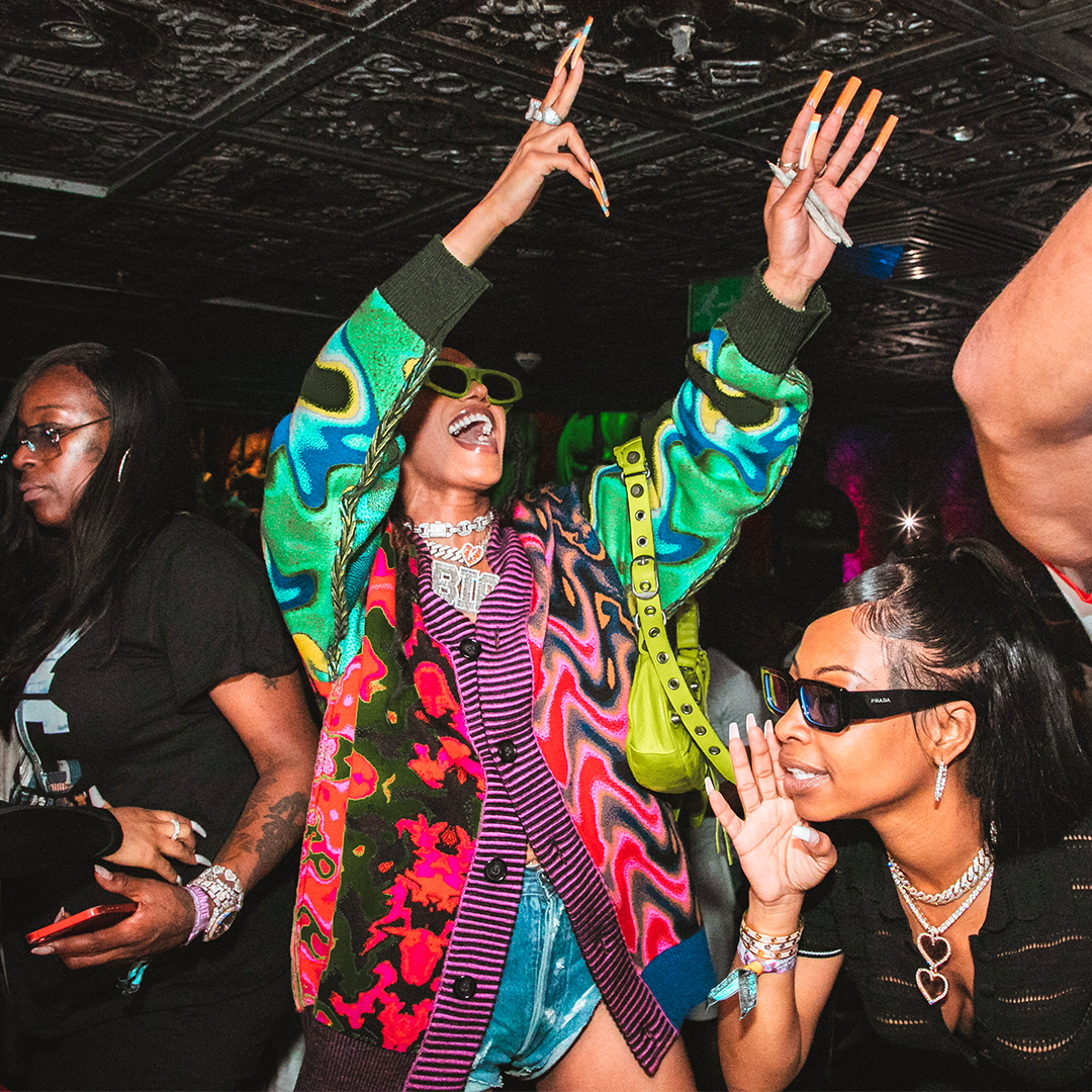 Meg Thee Stallion looking amazing at Universal Studios in full AGR. Wearing the SS23 AGR Burst Tee available to buy now on our webstore and SS23 Intimo Striped Trousers.
