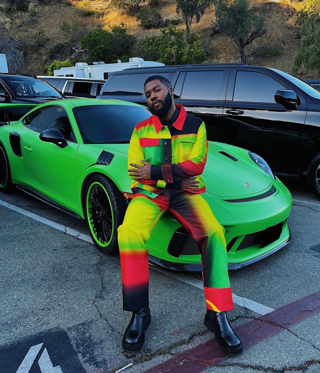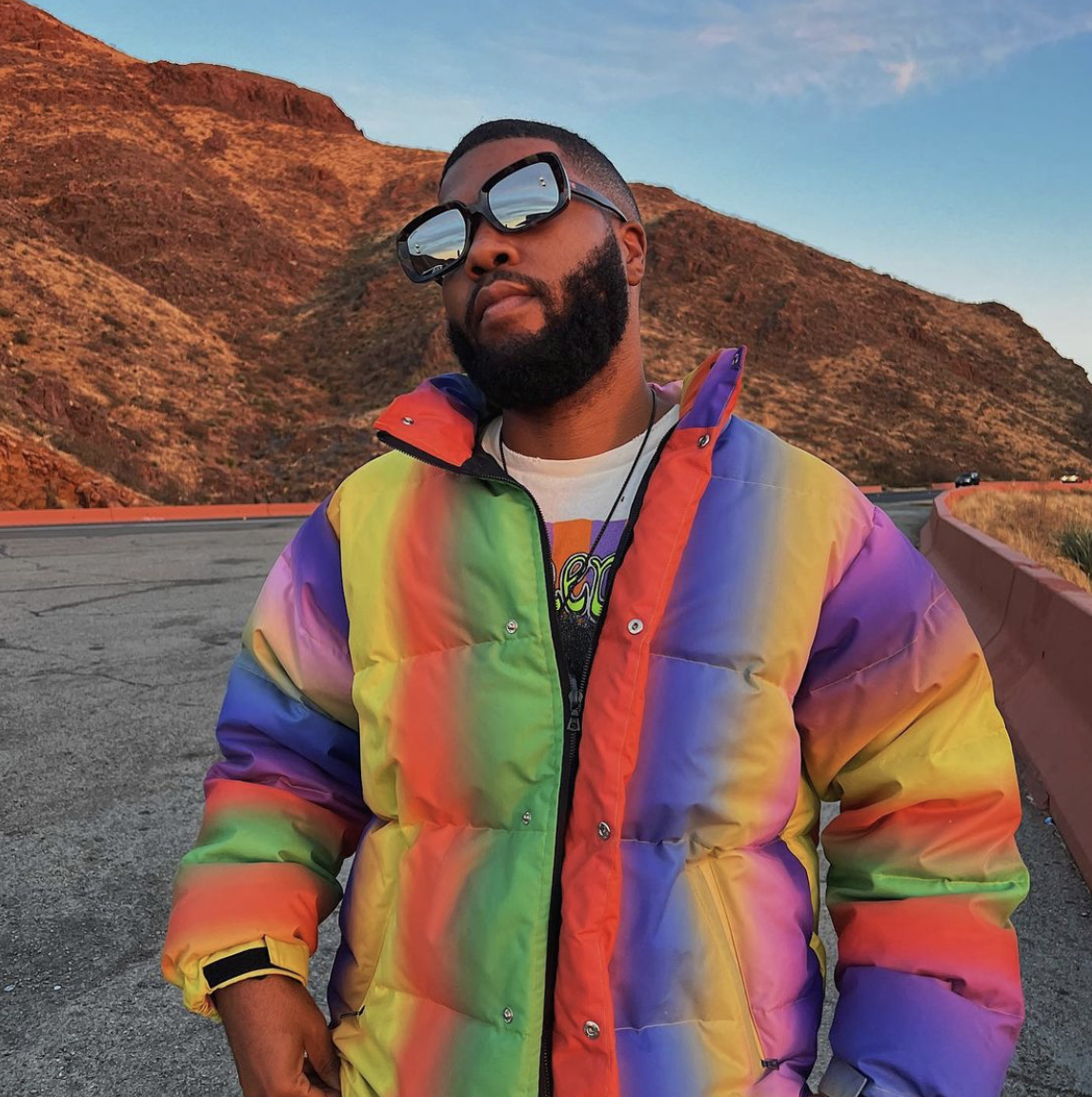 Khalid matching the sunset wearing AGR's AW21 gradient puffer jacket