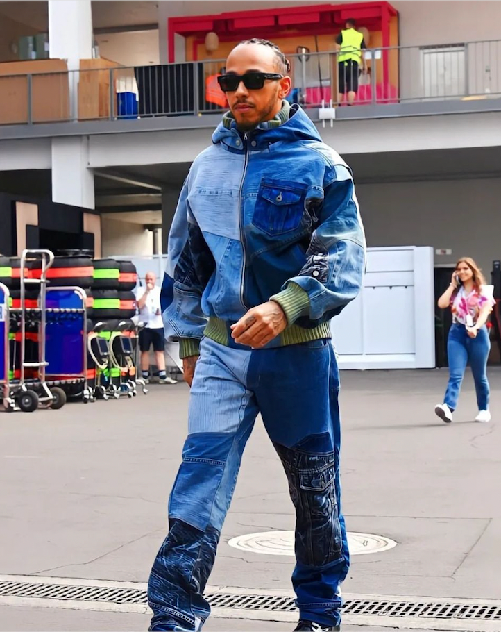 Lewis Hamilton in mexico wearing AGR's SS23 upcycled denim bomber & jeans set. In stores now.