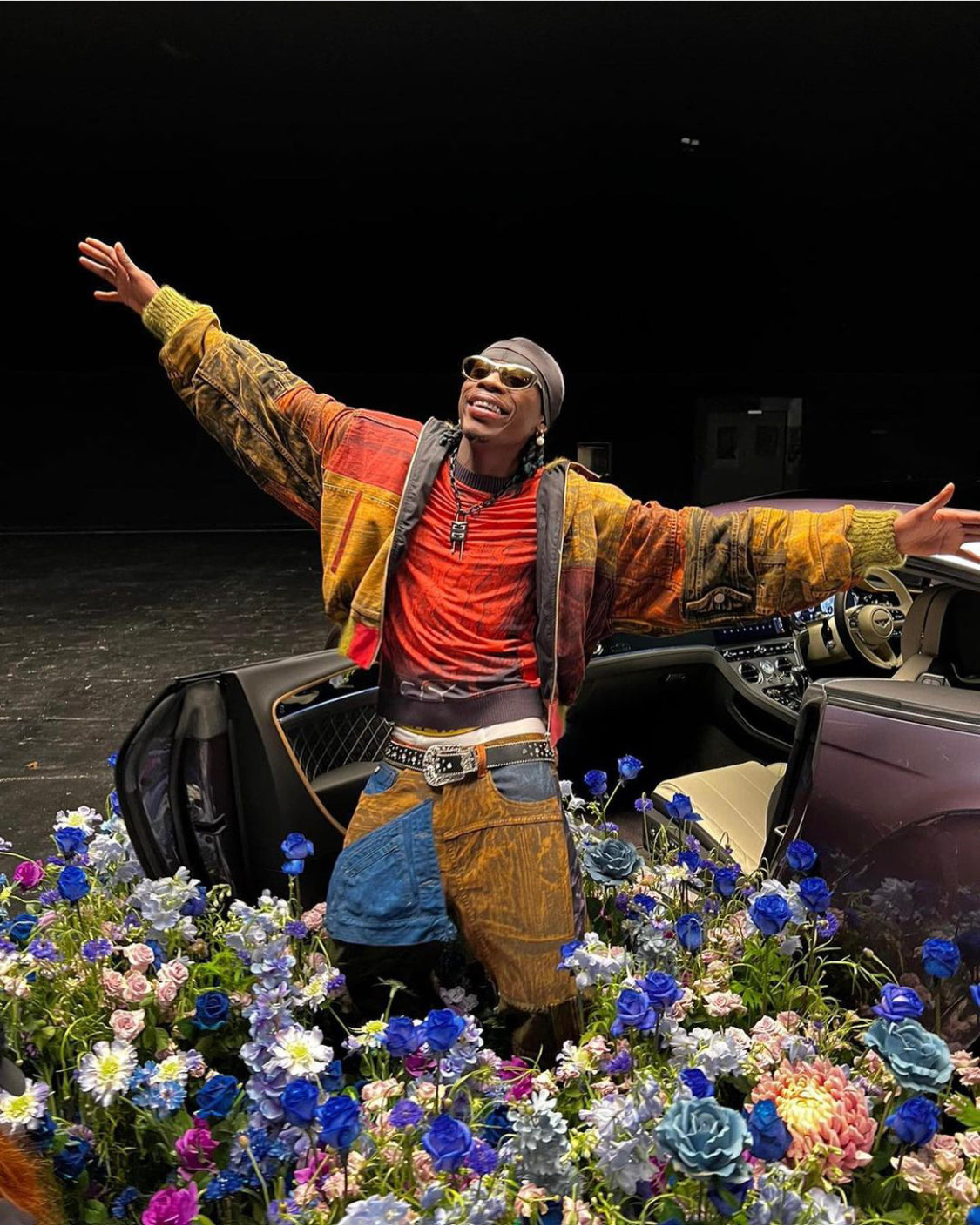 Burna Boy wearing AGR's AW22 crochet shirt filming the music video for 'own it'.