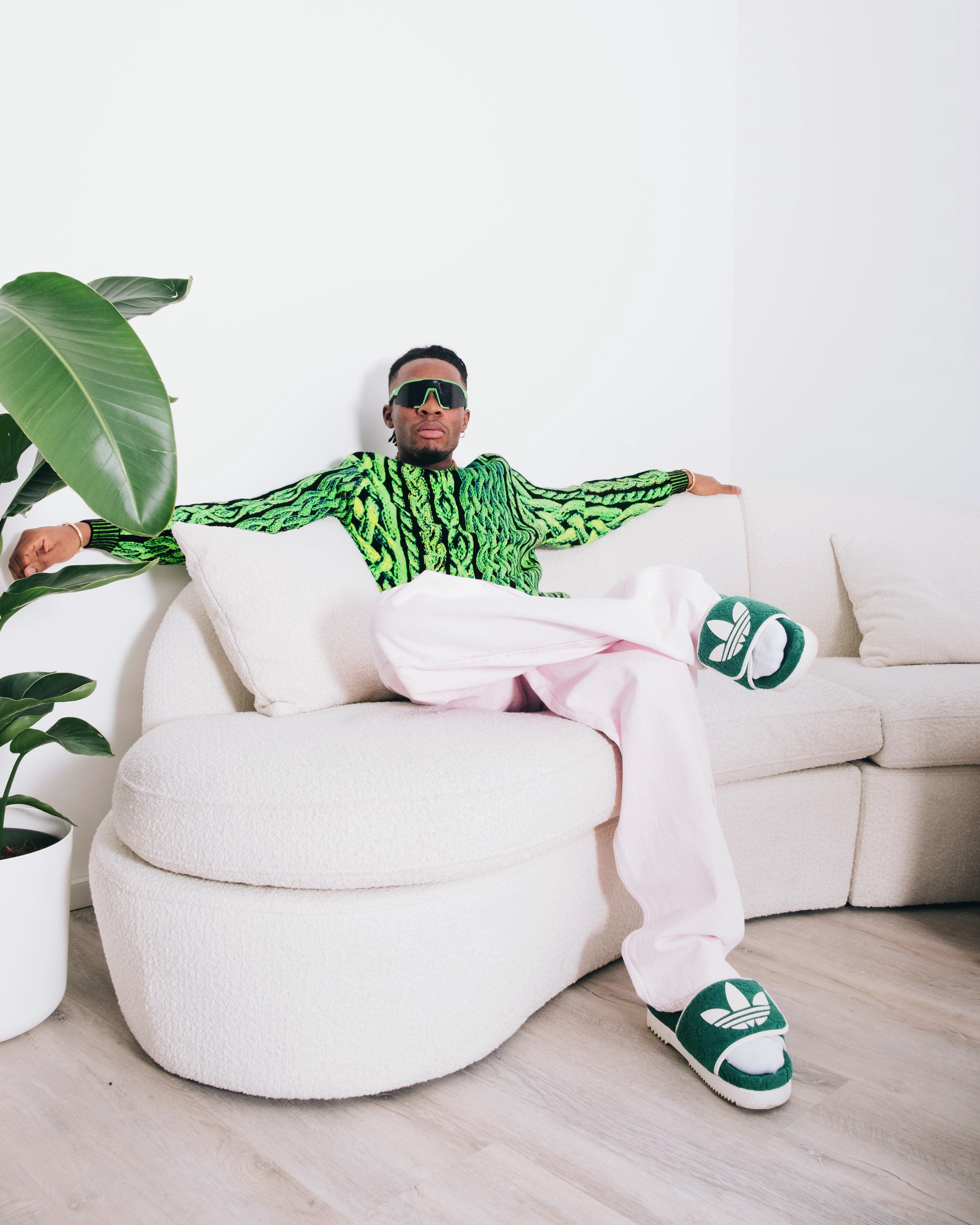 Joeboy on the cover of pause magazine wearing AGR's AW22 cable knit jumper